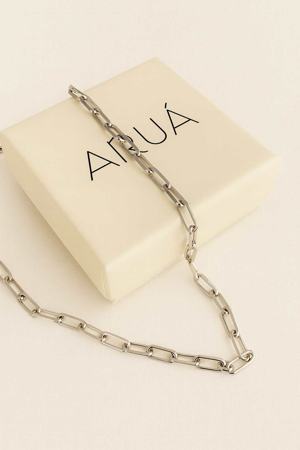 Atemporal, ligera, cómoda e hipoalergénica. Su brillo plateado y su forma minimalista evocan esa mezcla única entre sencillez moderna y elegancia bohemia que caracteriza a Aruá.