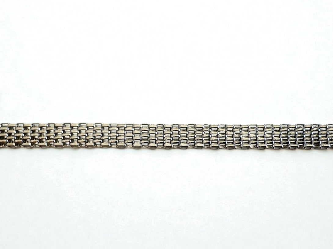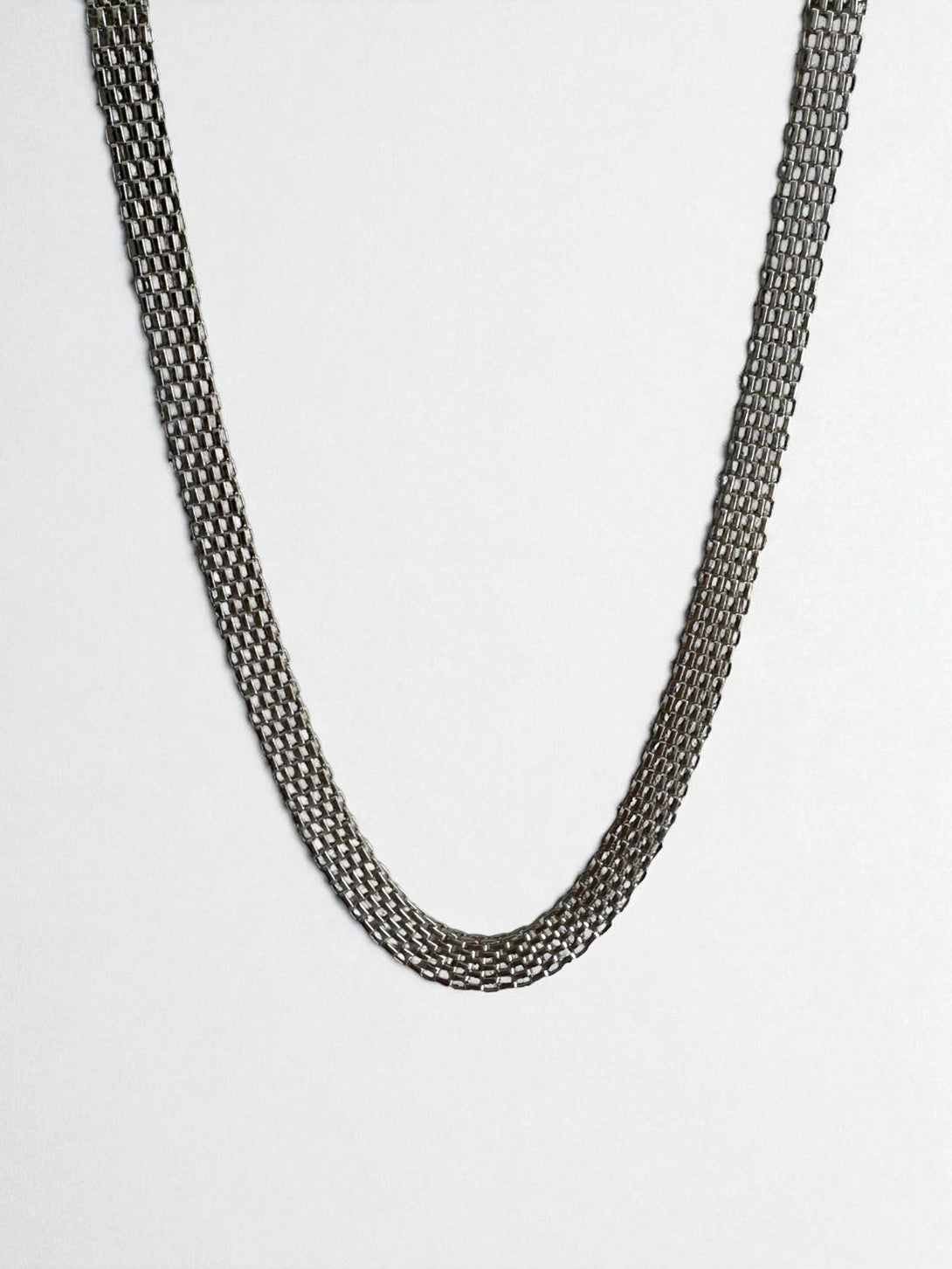 Diseño contemporáneo en malla estructurada que abraza el cuello con elegancia. Baño de rodio.