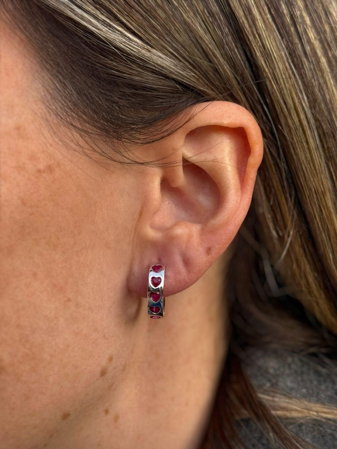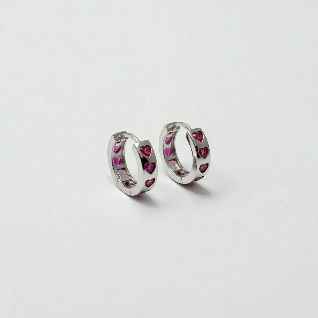 Nuestros Pendientes Rosa combinan el brillo del rodio con el encanto de circonitas en forma de corazón color rubí, creando una joya tan delicada como sofisticada.