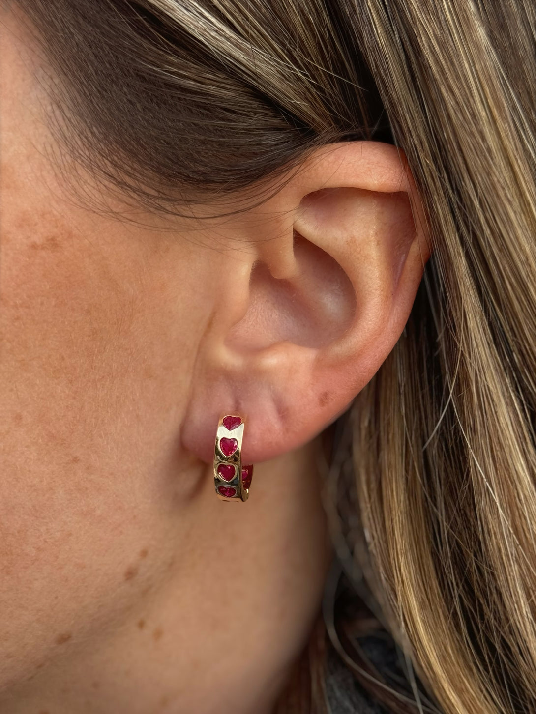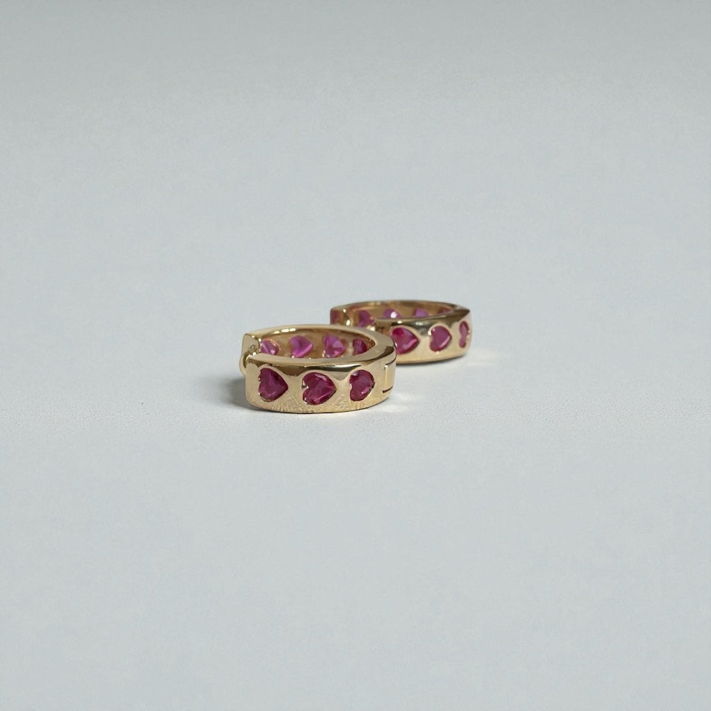 Nuestros Pendientes Rosa combinan la calidez del oro de 18 kt con el encanto de circonitas en forma de corazón color rubí, creando una joya tan delicada como sofisticada.